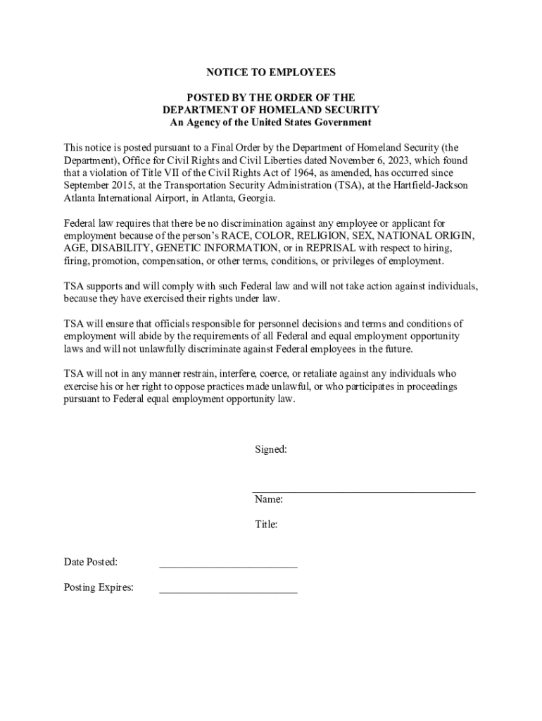 NOTICE TO EMPLOYEES POSTED BY THE ORDER OF THE DEPARTMENT OF HOMELAND SECURITY An Agency of the United States Government This notice is posted pursuant to a Final Order by the Department of Homeland
