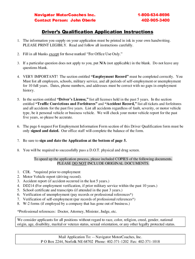 Navigator MotorCoaches Inc. Contact Person: John Oberle18006348696 4029053400Drivers Qualification Application Instructions 1. The information you supply on your application must be printed in ink