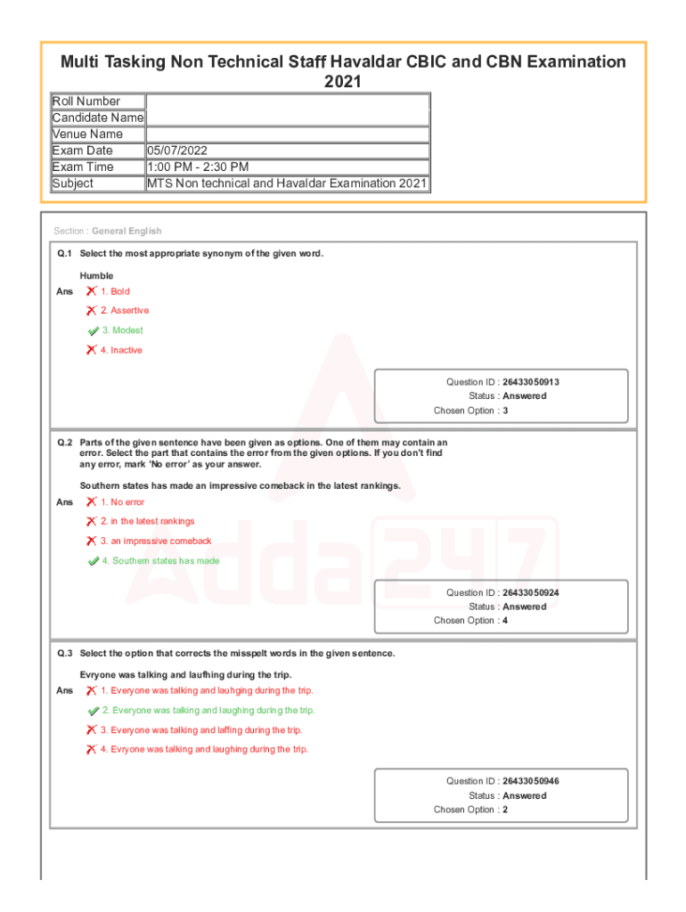 Multi Tasking Non Technical Staff Havaldar CBIC and CBN Examination 2021 Roll Number Candidate Name Venue Name Exam Date 05/07/2022 Exam Time 1:00 PM 2:30 PM Subject MTS Non technical and Havaldar