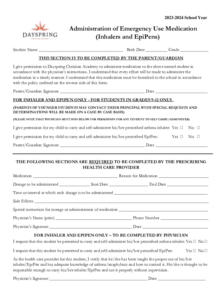 20232024 School YearAdministration of Emergency Use Medication (Inhalers and EpiPens) Student Name ___ Birth Date ___ Grade ___ THIS SECTION IS TO BE COMPLETED BY THE PARENT/GUARDIAN I give permission