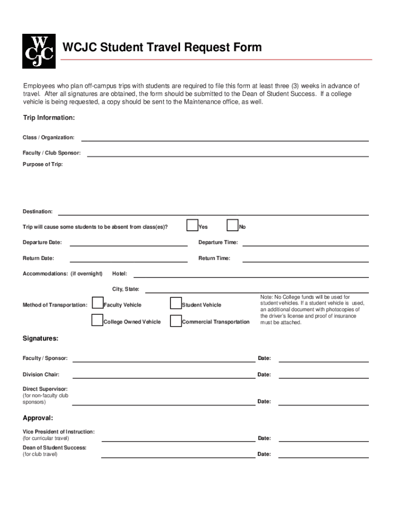 WCJC Student Travel Request Form Employees who plan offcampus trips with students are required to file this form at least three (3) weeks in advance of travel. After all signatures are obtained, the