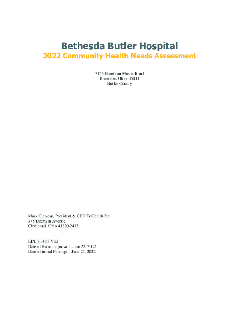 Bethesda Butler Hospital2022 Community Health Needs Assessment 3125 Hamilton Mason Road Hamilton, Ohio 45011 Butler CountyMark Clement, President & CEO TriHealth Inc. 375 Dixmyth Avenue Cincinnati,