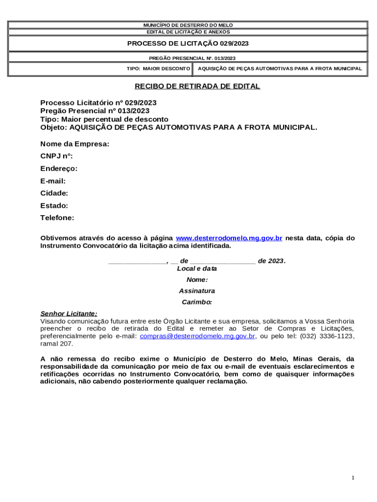 The Objeto: AQUISIO DE PEAS AUTOMOTIVAS PARA A FROTA MUNICIPAL is a writable document that should be submitted to the specific address to provide specific information. It must be completed and signed, which may be done manually in hard copy, or with a particular solution such as PDFfiller. This tool lets you fill out any PDF or Word document right in the web, customize it according to your requirements and put a legally-binding electronic signature. Right away after completion, the user can send the Objeto: AQUISIO DE PEAS AUTOMOTIVAS PARA A FROTA MUNICIPAL to the appropriate receiver, or multiple ones via email or fax. The template is printable too thanks to PDFfiller feature and options presented for printing out adjustment. Both in digital and physical appearance, your form should have a organized and professional look. You may also save it as the template to use later, there's no need to create a new blank form over and over. Just amend the ready form.