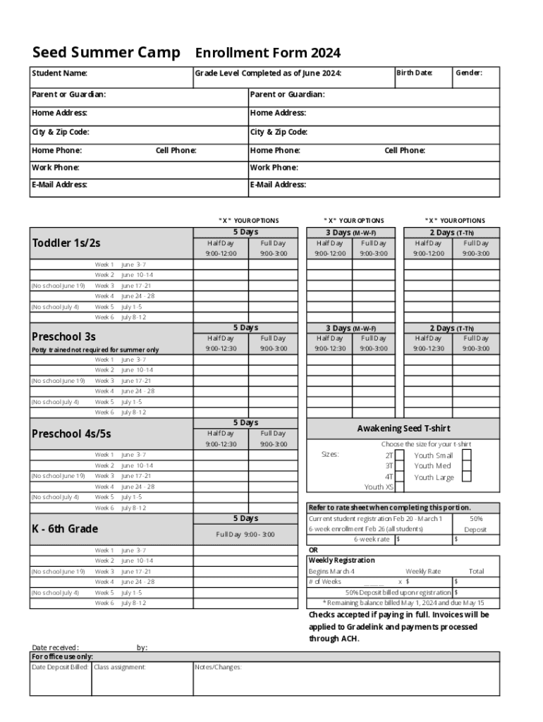 Seed Summer CampEnrollment Form 2024Student Name:Grade Level Completed as of June 2024:Parent or Guardian:Parent or Guardian:Home Address:Home Address:City & Zip Code:City & Zip Code:Home Phone:Cell