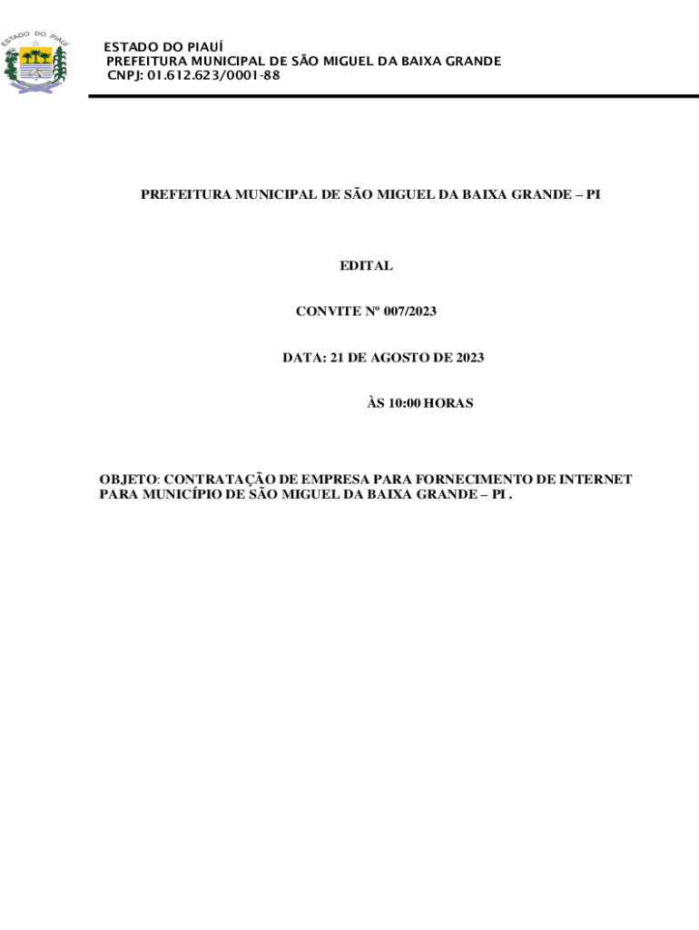 ESTADO DO PIAU PREFEITURA MUNICIPAL DE SO MIGUEL DA BAIXA GRANDE CNPJ: 01.612.623/000188PREFEITURA MUNICIPAL DE SO MIGUEL DA BAIXA GRANDE PIEDITALCONVITE N 007/2023DATA: 21 DE AGOSTO DE 2023S 10:00