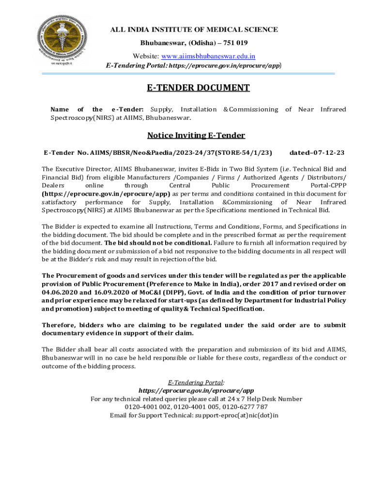 ALL INDIA INSTITUTE OF MEDICAL SCIENCE Bhubaneswar, (Odisha) 751 019 Website: www.aiimsbhubaneswar.edu.in ETendering Portal: https://eprocure.gov.in/eprocure/app)ETENDER DOCUMENT Name of the e Tender: