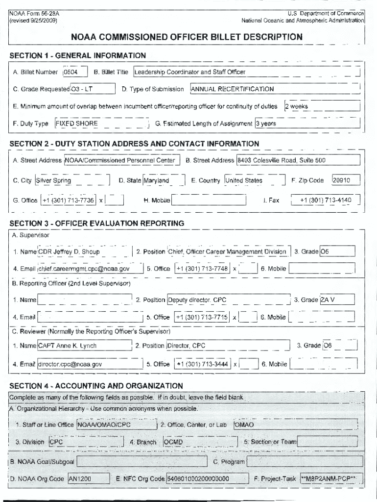 U.S. Department of Commerce National Oceanic and Atmospheric AdministrationNOAA Form 5628A (revised 9/25/2009)NOAA COMMISSIONED OFFICER BILLET DESCRIPTION SECTION 1 GENERAL INFORMATION A. Billet Number