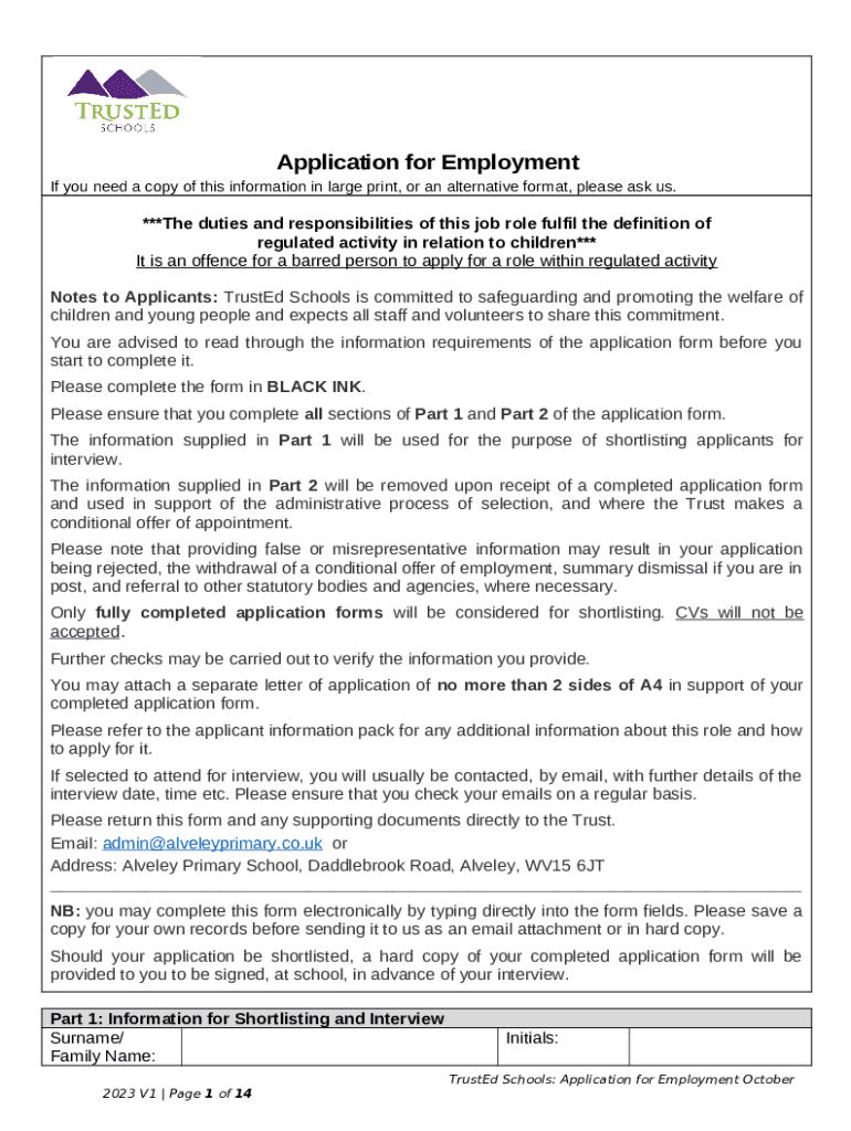 Instructions for the form Notes to Applicants: TrustEd Schools is committed to safeguarding and promoting the welfare of children and young people and expects all staff and volunteers to share this commitment