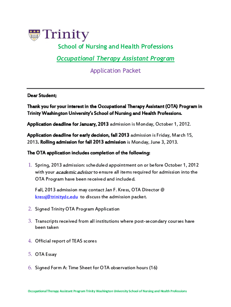 School of Nursing and Health Professions Occupational Therapy Assistant Program Application PacketDear Student; Thank you for your interest in the Occupational Therapy Assistant (OTA) Program in Trinity