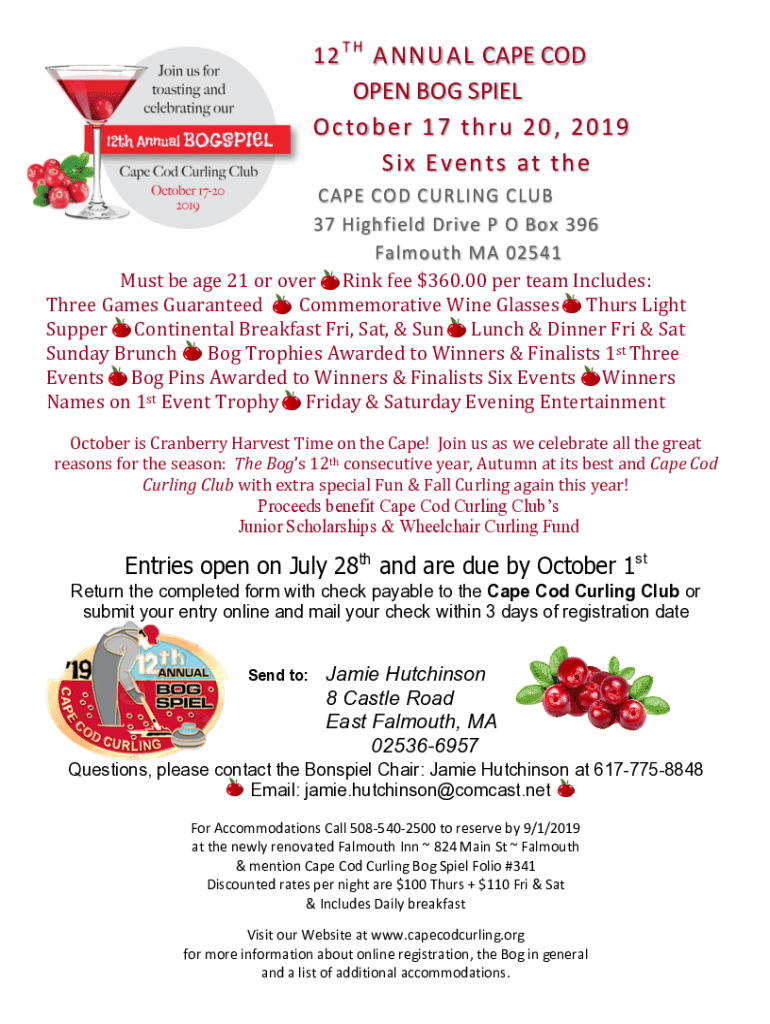 1 2 T HA N N U AL CAPE CODOPEN BOG SPIELO cto b e r 1 7 th r u2 0 , 2 01 9S ixE v en tsatth eCAPE COD CURLING CLUB37 Highfield Drive P O Box 396Falmouth MA 02541 Must be age 21 or overRink fee $360.00