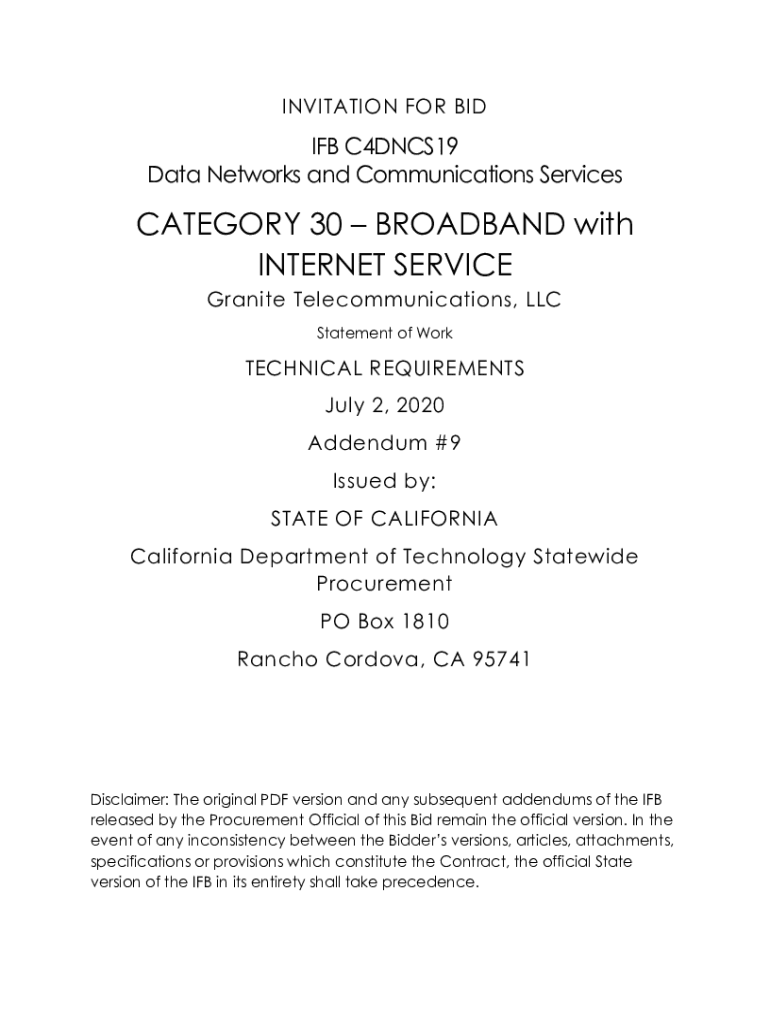 INVITATION FOR BIDIFB C4DNCS19 Data Networks and Communications ServicesCATEGORY 30 BROADBAND with INTERNET SERVICE Granite Telecommunications, LLC Statement of WorkTECHNICAL REQUIREMENTS July 2,