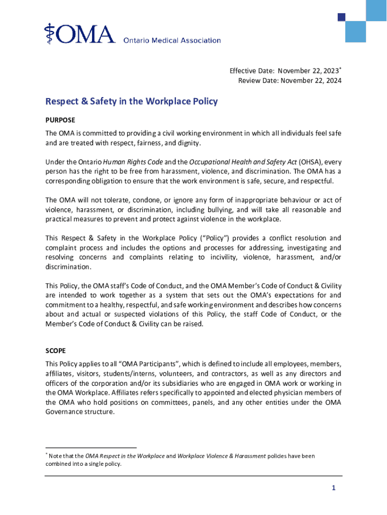 Effective Date: November 22, 2023* Review Date: November 22, 2024Respect & Safety in the Workplace Policy PURPOSE The OMA is committed to providing a civil working environment in which all individuals