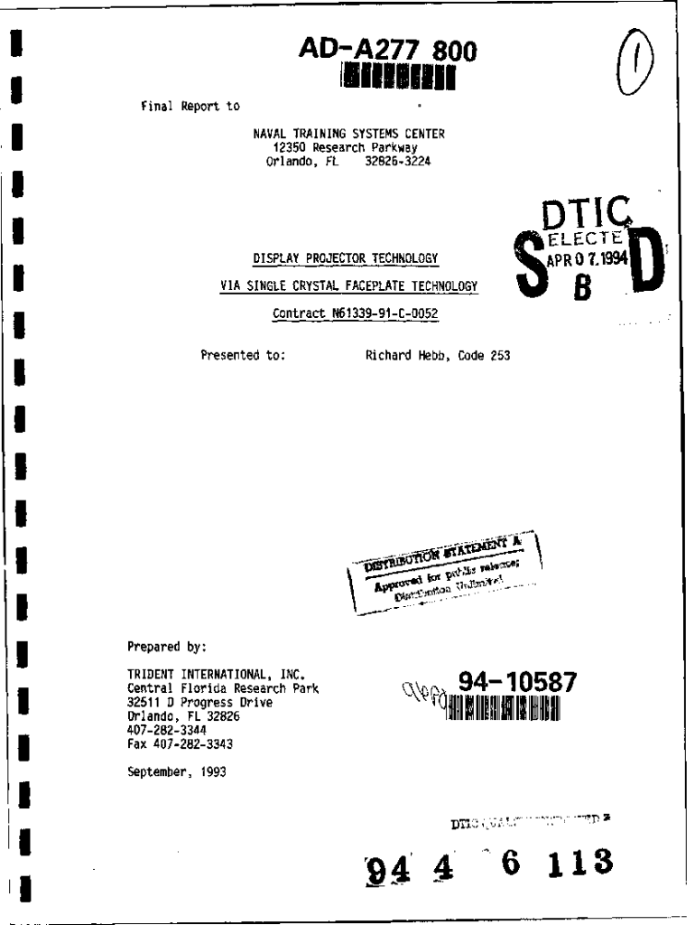 3ADA277 800 IFinal Report toNAVAL TRAINING SYSTEMS CENTER 12350 Research ParkwayOrlando, FL328263224E&%\'ECTE D TC IlI DISPLAY PROJECTOR TECHNOLOGYVIA SINGLE CRYSTAL FACEPLATE TECHNOLOGY iQEPRL E71fl4Contract