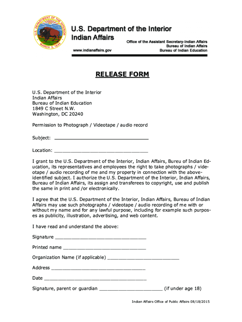 RELEASE FORM U.S. Department of the Interior Indian Affairs Bureau of Indian Education 1849 C Street N.W. Washington, DC 20240 Permission to Photograph / Videotape / audio record Subject: Location: