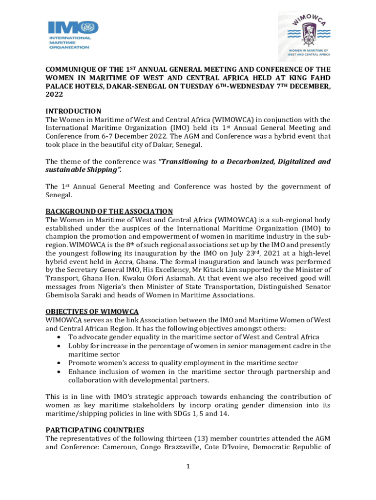 COMMUNIQUE OF THE 1ST ANNUAL GENERAL MEETING AND CONFERENCE OF THE WOMEN IN MARITIME OF WEST AND CENTRAL AFRICA HELD AT KING FAHD PALACE HOTELS, DAKARSENEGAL ON TUESDAY 6THWEDNESDAY 7TH DECEMBER,