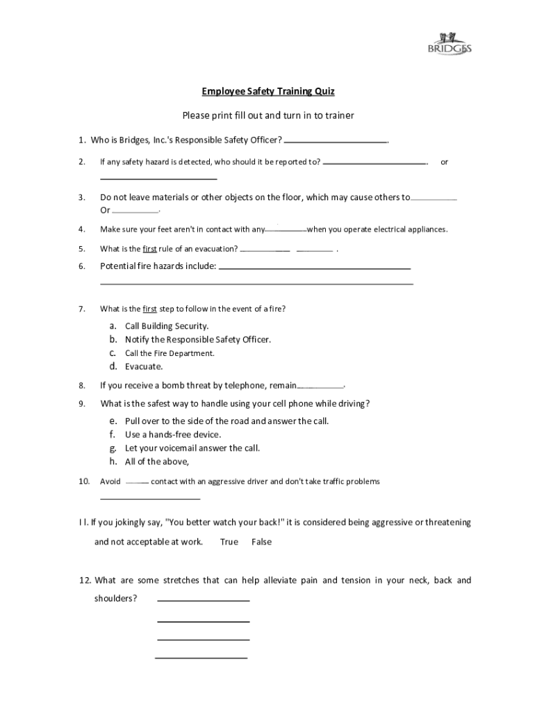 Employee Safety Training Quiz Please print fill out and turn in to trainer 1. Who is Bridges, Inc.\'s Responsible Safety Officer?. .2.If any safety hazard is detected, who should it be reported to?3.Do