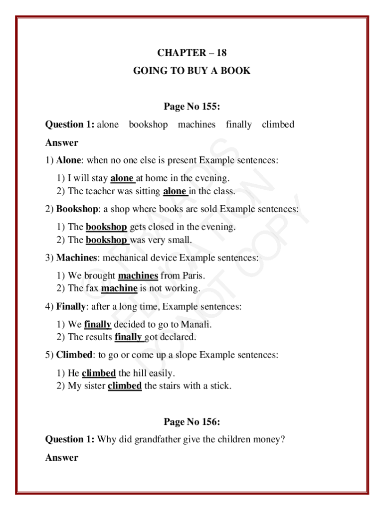 CHAPTER 18 GOING TO BUY A BOOKPage No 155: Question 1: alonebookshopmachines finally climbedAnswer ED PR DO U A C A NO A D T I T IO S CO N PY1) Alone: when no one else is present Example sentences: