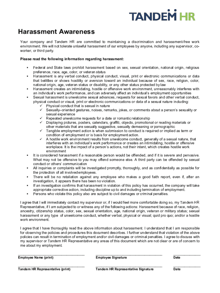 Harassment Awareness Your company and Tandem HR are committed to maintaining a discrimination and harassmentfree work environment. We will not tolerate unlawful harassment of our employees by anyone,