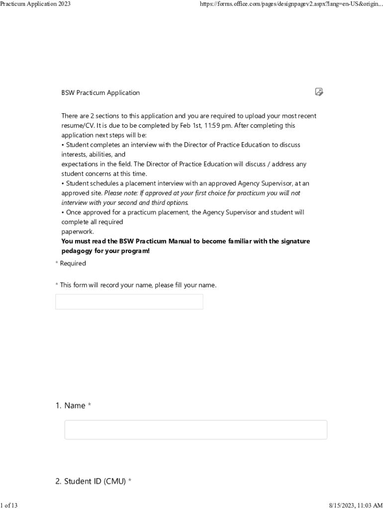 Practicum Application 20231 of 13https://forms.office.com/pages/designpagev2.aspx?langenUS&origin...BSW Practicum Application There are 2 sections to this application and you are required to upload