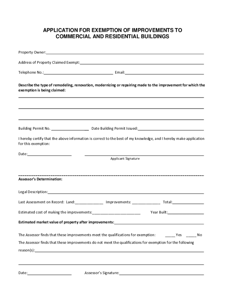 APPLICATION FOR EXEMPTION OF IMPROVEMENTS TO COMMERCIAL AND RESIDENTIAL BUILDINGS Property Owner: Address of Property Claimed Exempt: Telephone No.:Email:Describe the type of remodeling, renovation,