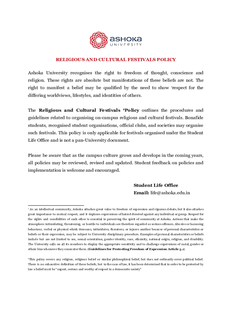 RELIGIOUS AND CULTURAL FESTIVALS POLICY Ashoka University recognises the right to freedom of thought, conscience and religion. These rights are absolute but manifestations of these beliefs are not.