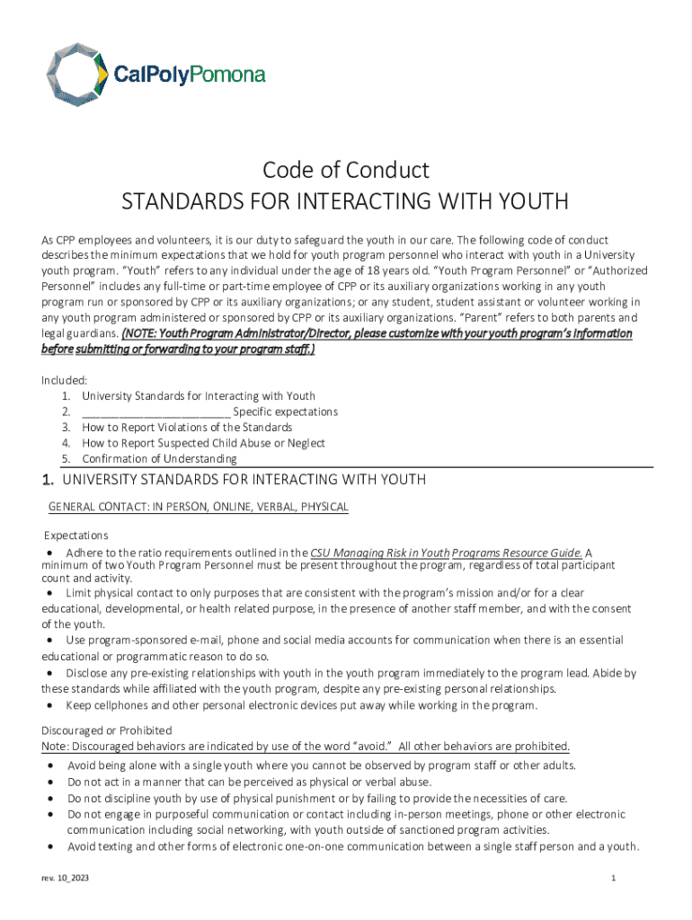 Get the free YPP-CPPState-Conduct-Code-Standards-for-Interacting-with-Youth Draft