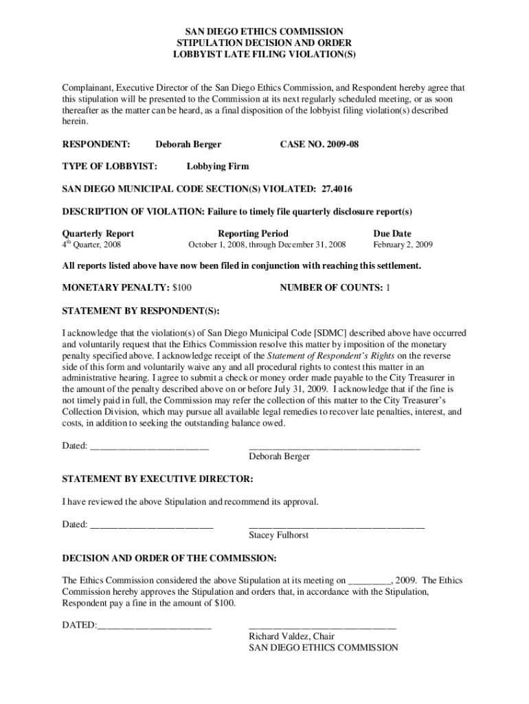 SAN DIEGO ETHICS COMMISSIONSTIPULATION DECISION AND ORDERLOBBYIST LATE FILING VIOLATION(S)Complainant, Executive Director of the San Diego Ethics Commission, and Respondent hereby agree that this