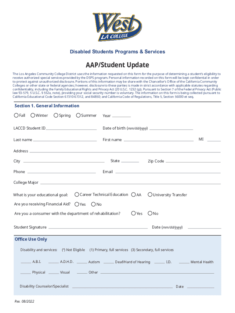 Disabled Students Programs & ServicesAAP/Student Update The Los Angeles Community College District uses the information requested on this form for the purpose of determining a students eligibility