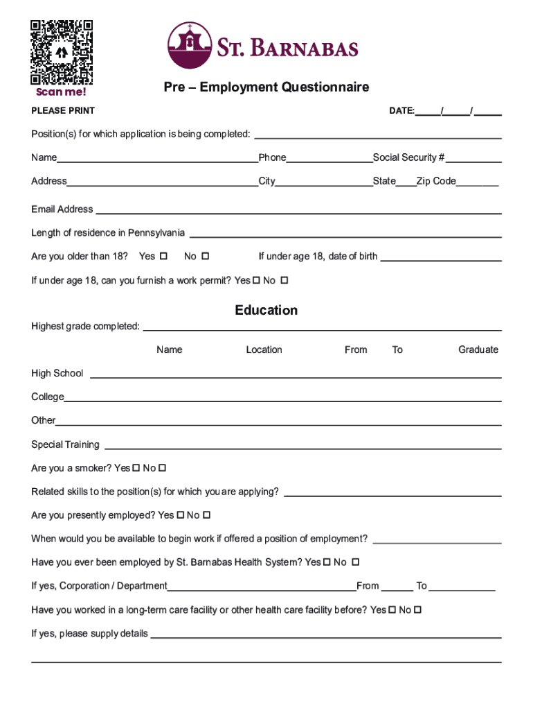 Get the free Pre Employment Questionnaire