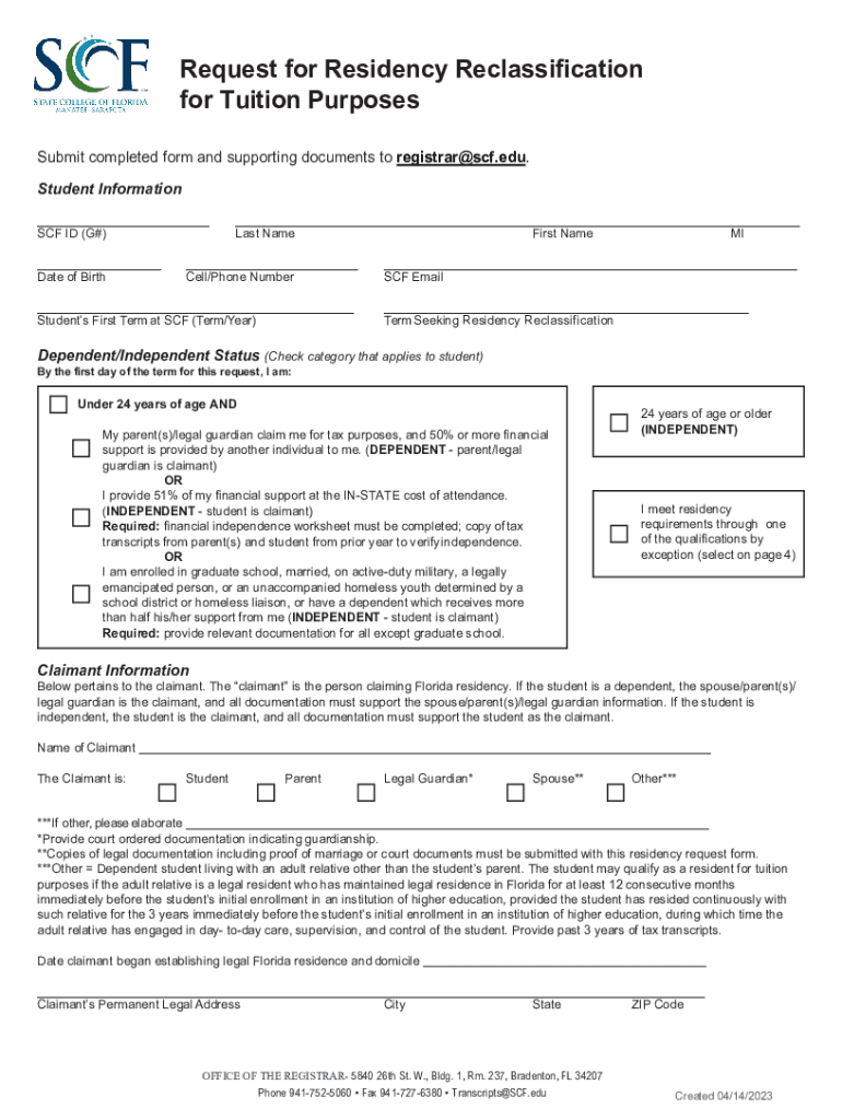 Request for Residency Reclassification for Tuition Purposes Submit completed form and supporting documents to registrar@scf.edu. Student Information SCF ID (G#)Last NameDate of BirthCell/Phone NumberStudents