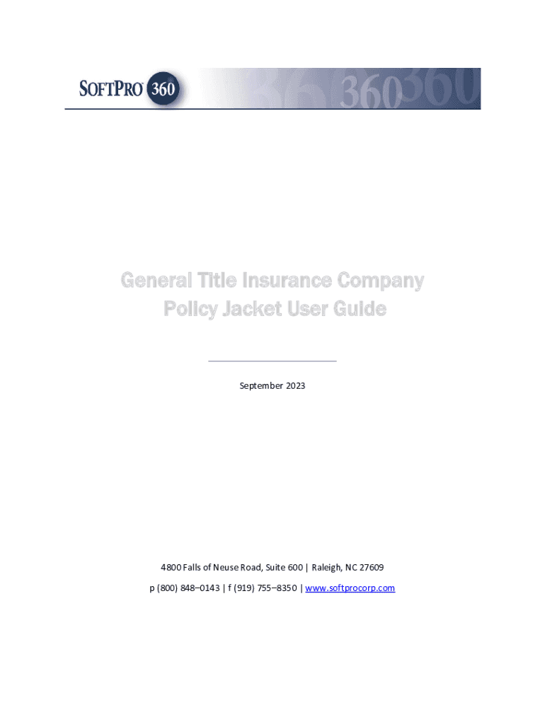 General Title Insurance Company Policy Jacket User GuideSeptember 20234800 Falls of Neuse Road, Suite 600 | Raleigh, NC 27609 p (800) 8480143 | f (919) 7558350 | www.softprocorp.comCopyright and Licensing