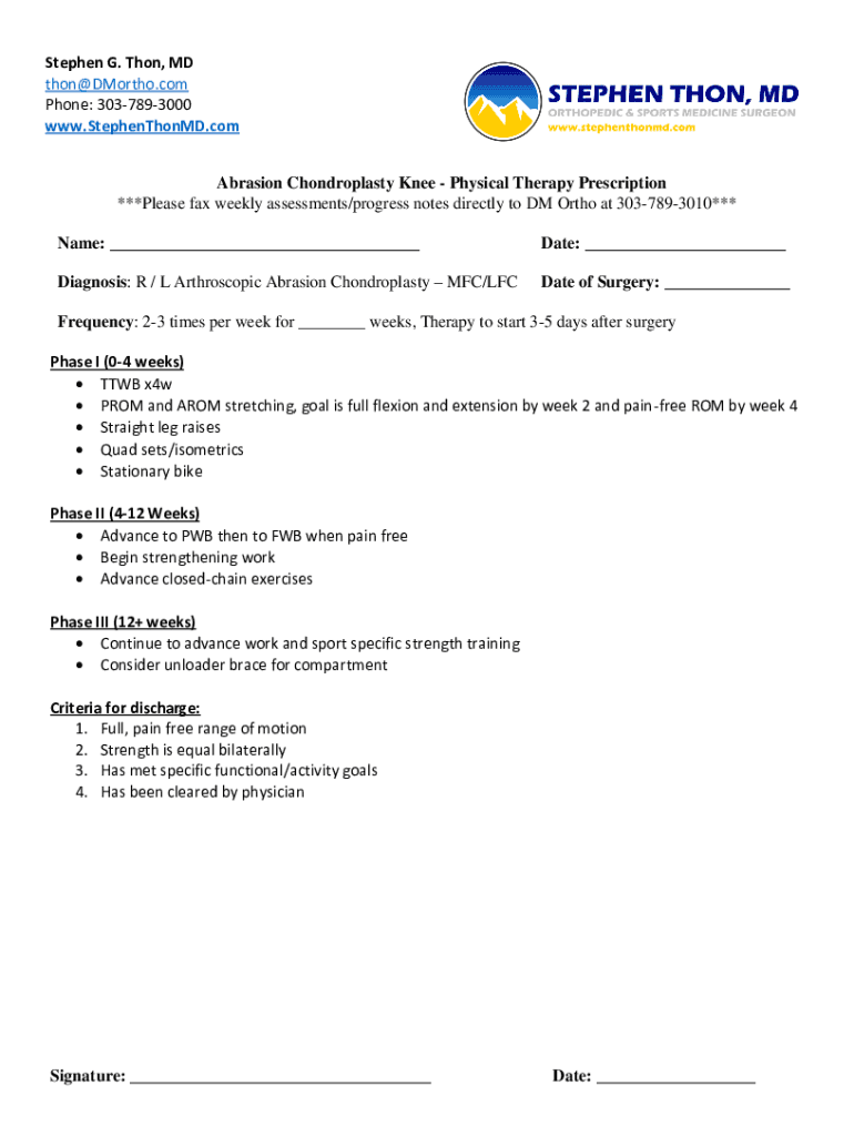 Stephen G. Thon, MD thon@DMortho.com Phone: 3037893000 www.StephenThonMD.com Abrasion Chondroplasty Knee Physical Therapy Prescription ***Please fax weekly assessments/progress notes directly to DM