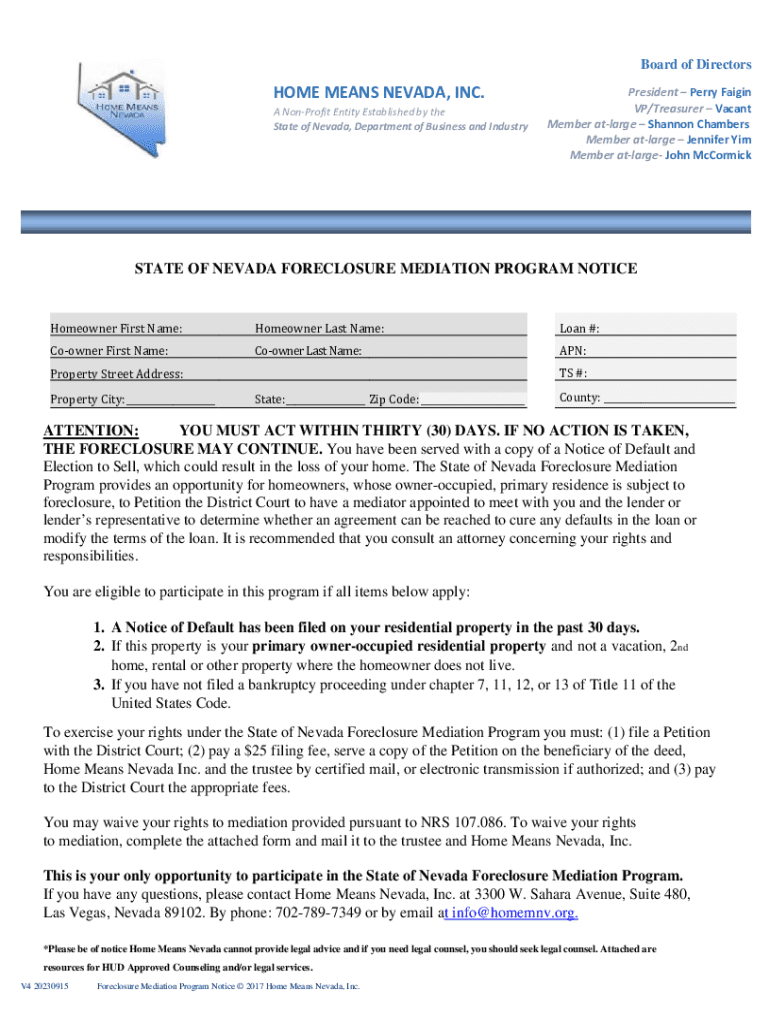 Board of DirectorsHOME MEANS NEVADA, INC. A NonProfit Entity Established by the State of Nevada, Department of Business and IndustryPresident Perry Faigin VP/Treasurer Vacant Member atlarge Shannon