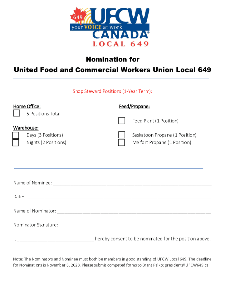 Nomination for United Food and Commercial Workers Union Local 649 Shop Steward Positions (1Year Term): Home Office: 5 Positions Total Warehouse: Days (3 Positions) Nights (2 Positions)Feed/Propane: