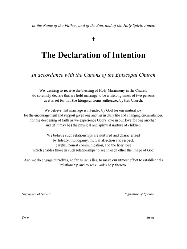 In the Name of the Father, and of the Son, and of the Holy Spirit. Amen.+ The Declaration of Intention In accordance with the Canons of the Episcopal Church We, desiring to receive the blessing of