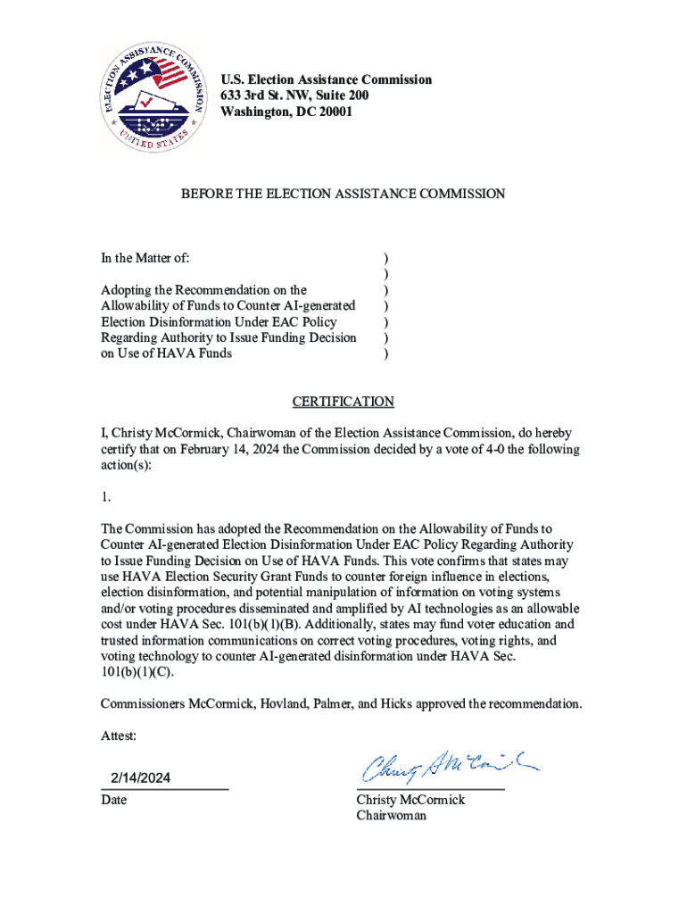 U.S. Election Assistance Commission 633 3rd St. NW, Suite 200 Washington, DC 20001BEFORE THE ELECTION ASSISTANCE COMMISSIONIn the Matter of: Adopting the Recommendation on the Allowability of Funds