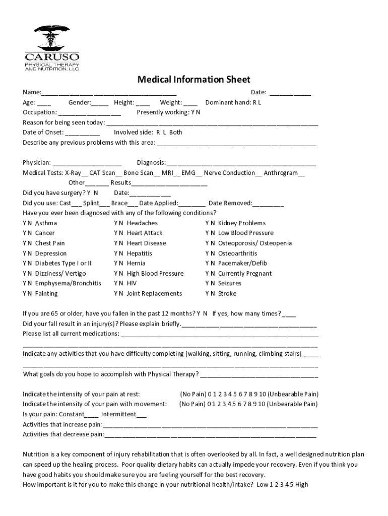 Medical Information Sheet Name:___ Date: ___ Age: ___ Gender:___ Height: ___ Weight: ___ Dominant hand: R L Occupation: ___ Presently working: Y N Reason for being seen today: ___ Date of Onset: ___