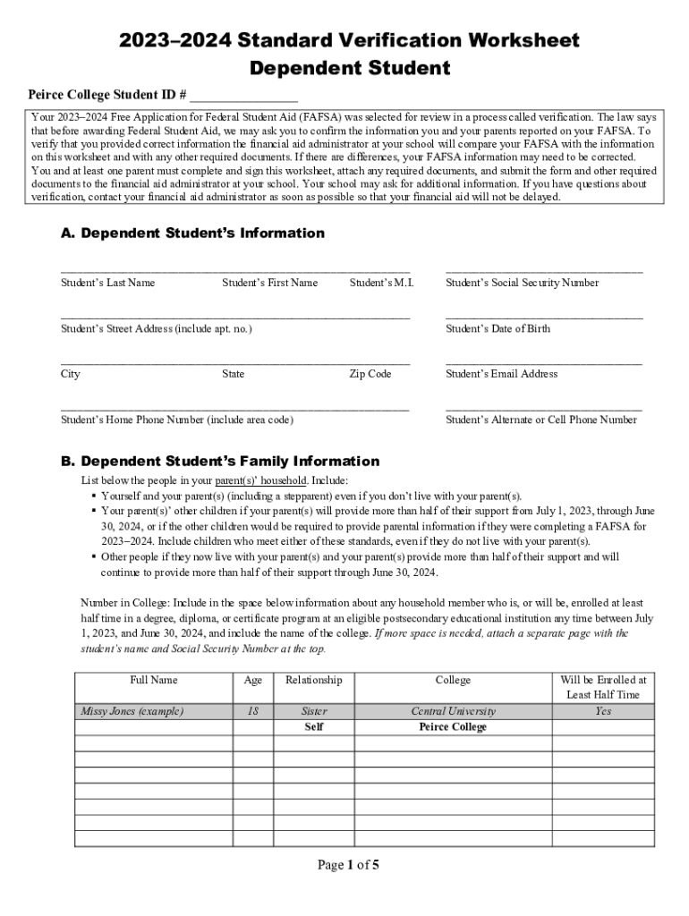 20232024 Standard Verification Worksheet Dependent Student Peirce College Student ID # ___ Your 20232024 Free Application for Federal Student Aid (FAFSA) was selected for review in a process called