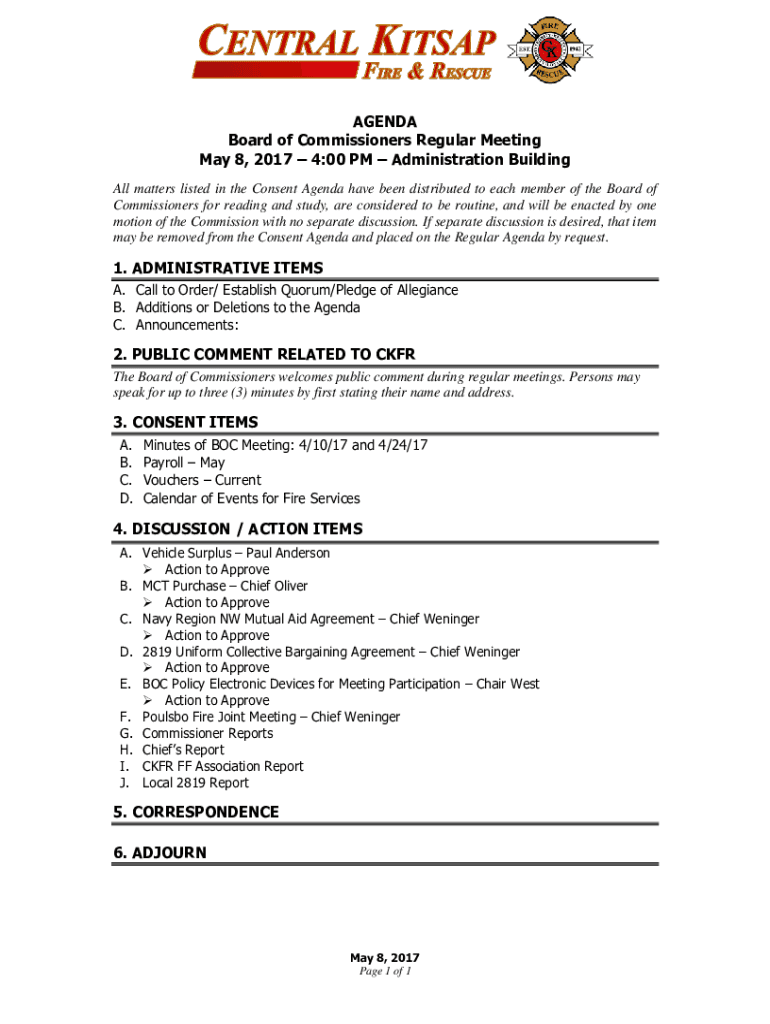 AGENDA Board of Commissioners Regular Meeting May 8, 2017 4:00 PM Administration Building All matters listed in the Consent Agenda have been distributed to each member of the Board of Commissioners