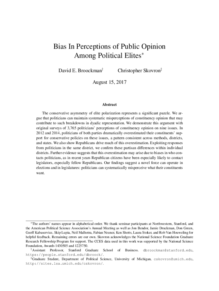 Bias In Perceptions of Public Opinion Among Political Elites David E. BroockmanChristopher SkovronAugust 15, 2017Abstract The conservative asymmetry of elite polarization represents a significant