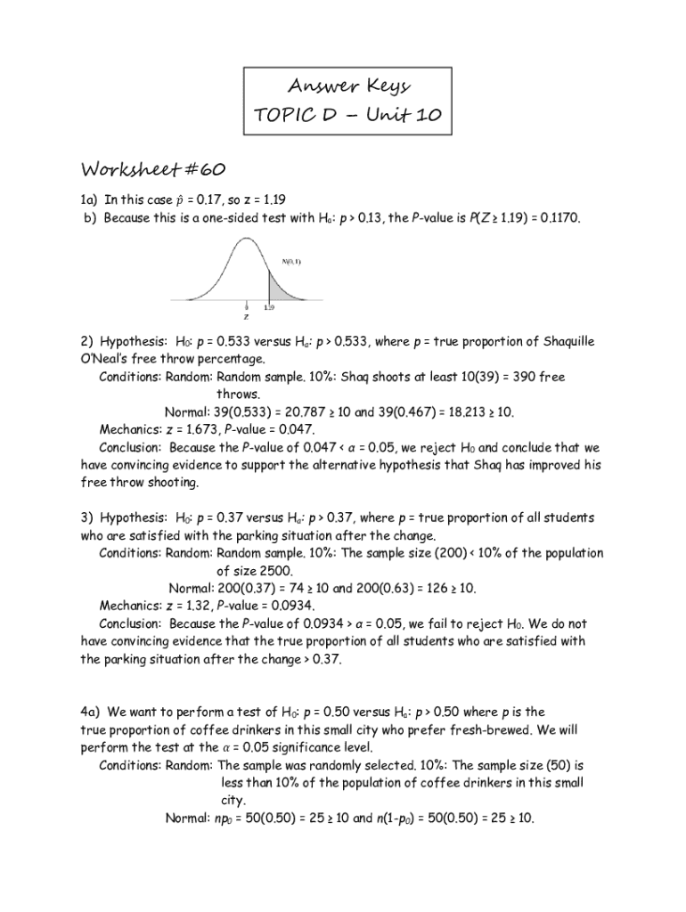 Answer Keys TOPIC D Unit 10 Worksheet #60 1a) In this case 0.17, so z 1.19 b) Because this is a onesided test with Ha: p 0.13, the Pvalue is P(Z 1.19) 0.1170.2) Hypothesis: H0: p 0.533 versus Ha: