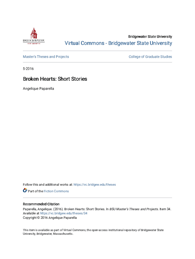 Bridgewater State UniversityVirtual Commons Bridgewater State University Masters Theses and ProjectsCollege of Graduate Studies52016Broken Hearts: Short Stories Angelique PaparellaFollow this and