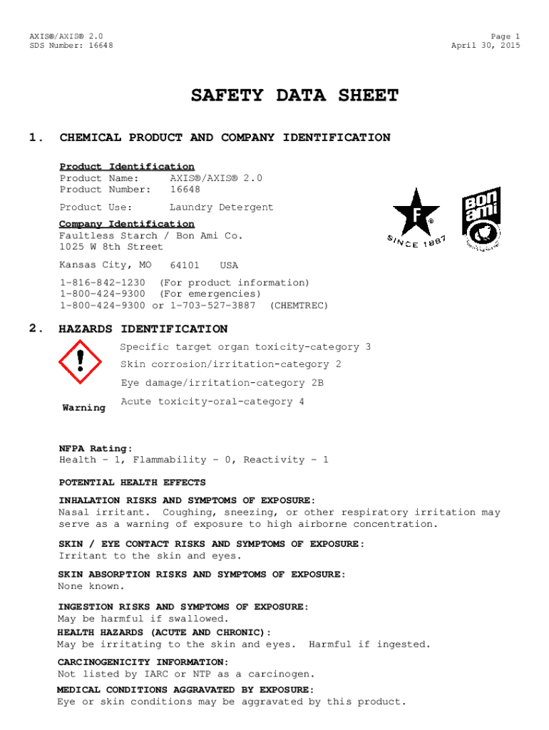 AXIS/AXIS 2.0 SDS Number: 16648Page 1 April 30, 2015SAFETY DATA SHEET 1.CHEMICAL PRODUCT AND COMPANY IDENTIFICATION ___ Product Identification Product Name: AXIS/AXIS 2.0 Product Number: 16648 Product