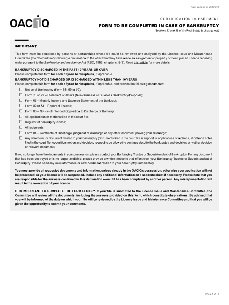 Form updated on 20231212C E R T I F I C AT I O N D E PA R T M E N TFORM TO BE COMPLETED IN CASE OF BANKRUPTCY (Sections 37 and 38 of the Real Estate Brokerage Act)IMPORTANT This form must be completed