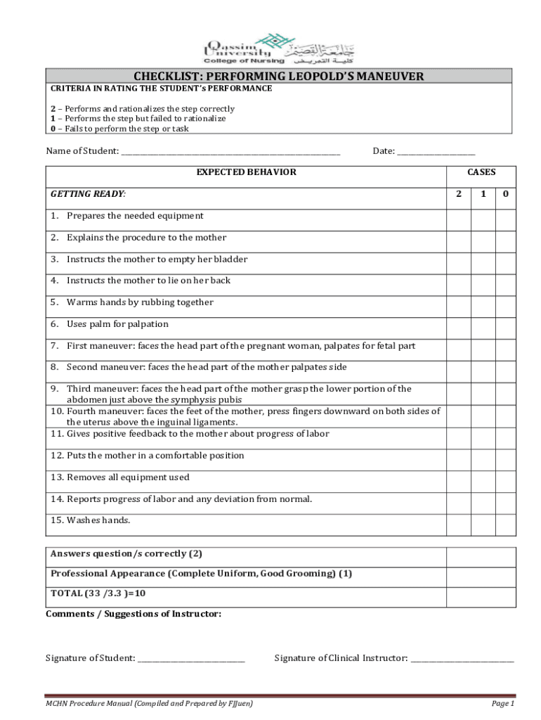 CHECKLIST: PERFORMING LEOPOLDS MANEUVER CRITERIA IN RATING THE STUDENTs PERFORMANCE 2 Performs and rationalizes the step correctly 1 Performs the step but failed to rationalize 0 Fails to perform