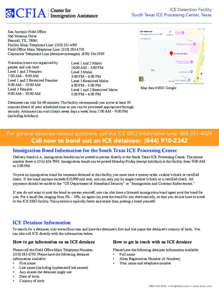 ICE Detention Facility South Texas ICE Processing Center, TexasSan Antonio Field Office 566 Veterans Drive Pearsall, TX, 78061 Facility Main Telephone Line: (210) 2314505 Field Office Main Telephone