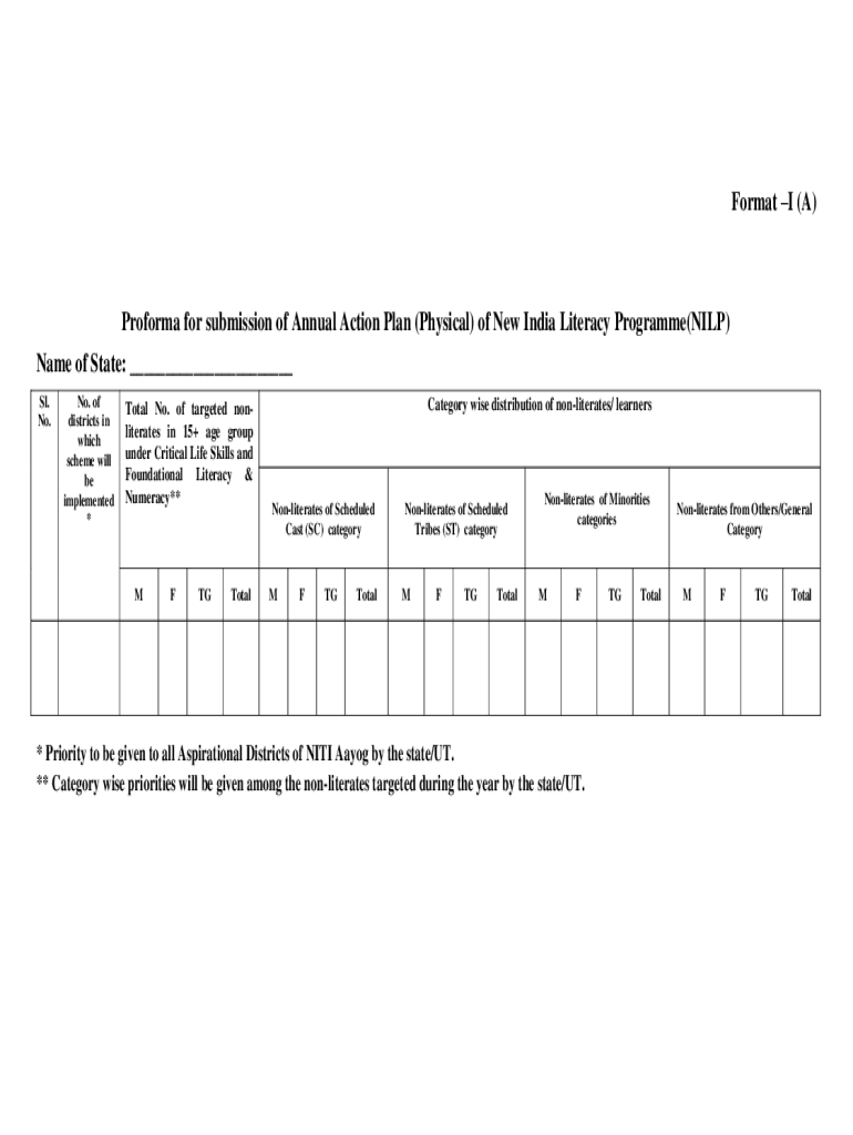 Format I (A)Proforma for submission of Annual Action Plan (Physical) of New India Literacy Programme(NILP) Name of State: ___ Sl. No.No. of districts in which scheme will be implemented *Total No.