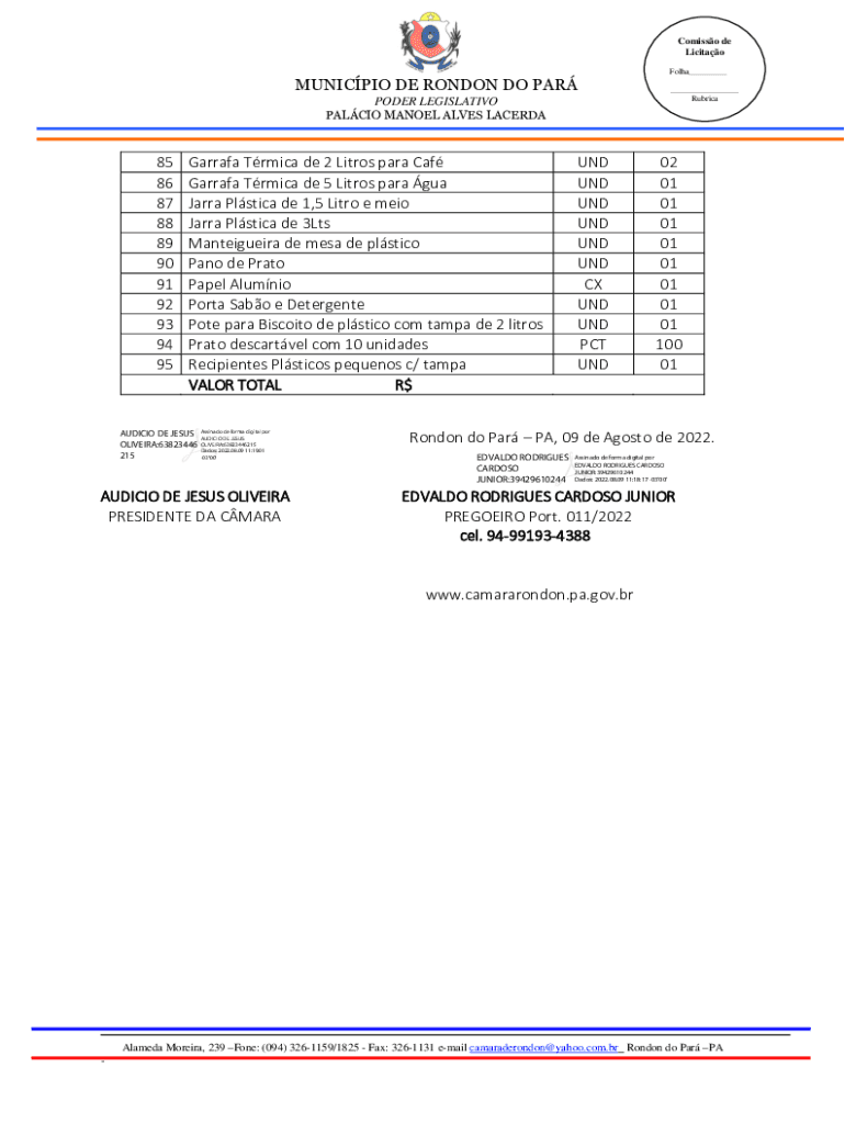Comisso de Licitao Folha___MUNICPIO DE RONDON DO PAR PODER LEGISLATIVO PALCIO MANOEL ALVES LACERDA___ RubricaEDITAL DE PREGO N 2022/001 CMRP. TIPO MENOR PREO POR ITEMRECIBO DE RETIRADA DE EDITAL PREGO