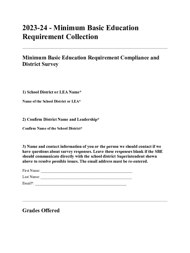 202324 Minimum Basic Education Requirement Collection Minimum Basic Education Requirement Compliance and District Survey1) School District or LEA Name* Name of the School District or LEA*2) Confirm