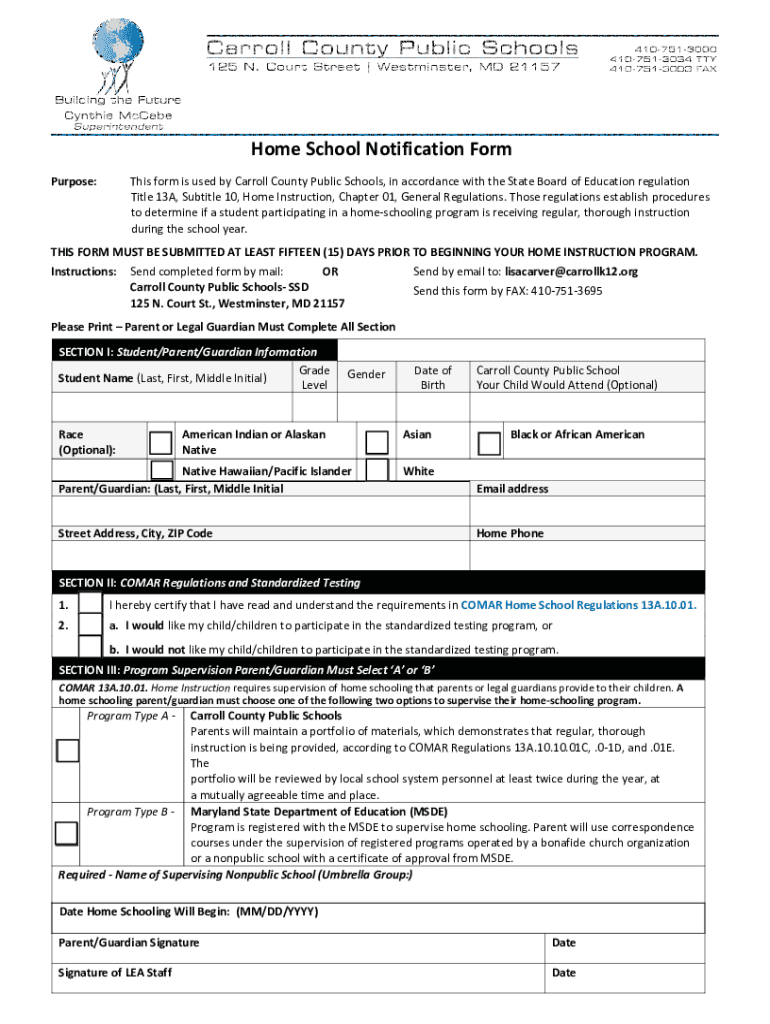 Home School Notification Form Purpose:This form is used by Carroll County Public Schools, in accordance with the State Board of Education regulation Title 13A, Subtitle 10, Home Instruction, Chapter